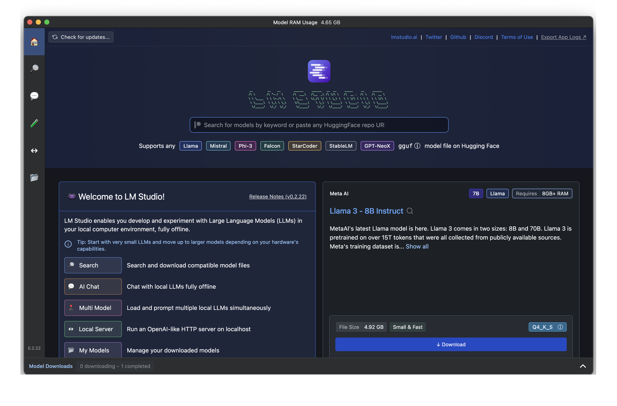1-click install. No models in included, so you'll have to download the first one. Average UI/UX (but improving). Closed-Source. Privacy statement on homepage. Advanced coding features and comparison playground is a huge plus for LM Studio. Works with any model on hugging face with GGUF. These are downloaded and stored locally. No integration with proprietary or remote models.